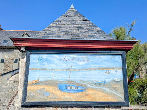The stunning location of Port Saint-Suliac, Quai de Rance, Saint-Suliac overlooking the River Rance. There are a small number of restaurants overlooking the water and a car park. There are distant views up to the Oratoire de Grainfollet - dedicated to the Virgin was built in 1894, following a vow made by the prior and the sailors of the village before the 1893 fishing campaign in Newfoundland from the port at Saint-Suliac. This is a lovely spot to sit and enjoy the views over the water from one of the many benches adjacent to the waterside.