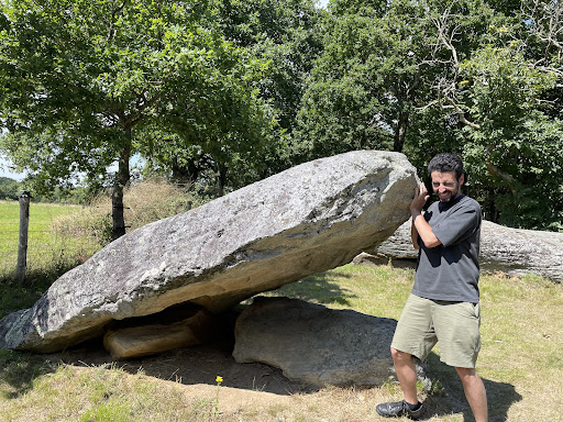 Après avoir admiré le menhir de Pierre-Lematz et de Chevanou, le Dolmen des Platennes nous a quand même surpris. L’inclinaison de son menhir central, lourd et imposant, nous rappelle tout le travail qu’a dû effectuer Obelix avant de pouvoir porter le sien à bout de bras. Comme l’illustre la photo, il est très compliqué de le déplacer sans boire la fameuse potion magique. Je retenterai mon coup...