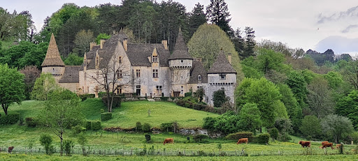A beautiful château, with many towers and out buildings, totally covered with lauze roof. It's privately owned and occupied. 3 lovely donkeys in the fields , as well as cows with their young. Lovely walk through the woods surrounding...