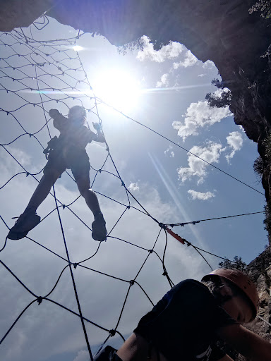 Nous avons demandé quel était le niveau de difficulté par rapport à de l’accrobranche et le monsieur nous a répondu que c’était beaucoup plus simple, ce qui n’a pas été du tout le cas. Je tenais à mentionner le fait que le matériel est vétuste. Un casque a rendu l’âme pendant la session. Au niveau du filet des cordes étaient sectionnées. Niveau sécurité, certaines choses sont à revoir. Des chaussures adaptées sont à prévoir. Évitez les baskets qui n’ont pas d’adhérence. Prévoyez à manger et à boire en conséquence. En cas de problème pendant le parcours, vous pouvez uniquement compter sur votre portable et le 112… pour vous secourir !🥲 Pour les personnes sportives c’est top! La vue reste magnifique! Ce ne fut pas une bonne expérience pour tout le groupe mais ça restera un souvenir car maintenant nous...