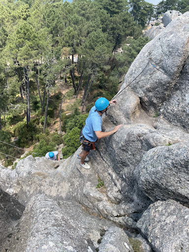 We couldn't miss the Xtrem Sud Park when visiting Corsica. The difficulty is divided into 3 colors (yellow - easy, blue - more difficult, red - difficult). Each color takes 2-3 hours and is divided into 5-7 parts. We went on the yellow one, it's pretty much like a rope park in our country. In the Czech Republic, there's a hole in the rock or a crack here and there. Those who are obese will have trouble sliding through it. Then we went on the blue 5 (panoramic). Before you go there, really consider whether you can do it with children. We went with girls aged 9 and 12. The blue section alone took us 3 hours and it's really nerve-wracking and in places it requires experience. There's an instructor available at the top, just in case. We enjoyed the descents down the cable car. I definitely recommend visiting this park. The advantage is that it was completely in the shade (except for the climbing...