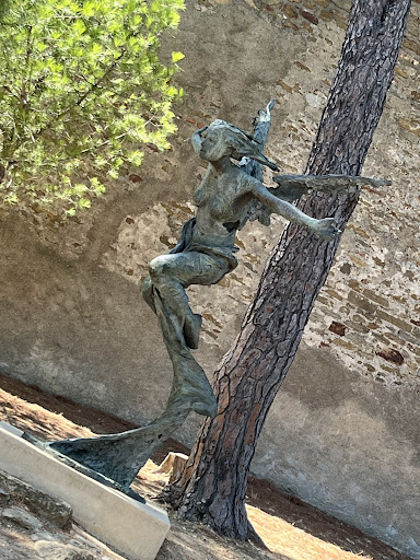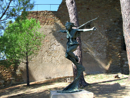 A Statue of Victory (2017) by Christophe Charbonnet stands before the Chateau des Seigneurs de Fos in Bormes-les-Mimosas southwest of Saint-Tropez, France. In the 13th and 14th centuries the counts of Provence were based here. Today the castle is a private residence and not open to the public. A view as far as Île du Levant is obtained from the small park next...
