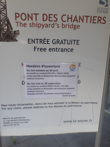 Read moreLe pont levant de La Seyne-sur-Mer est un pont basculant métallique situé dans le port de La Seyne-sur-Mer, dans le Var, en France. Il fait partie des installations des anciens chantiers navals de La Seyne-sur-Mer. ♿Parking gratuit à disposition (zone bleue :AVEC disque de stationnement ). accessible aux ♿personnes à...