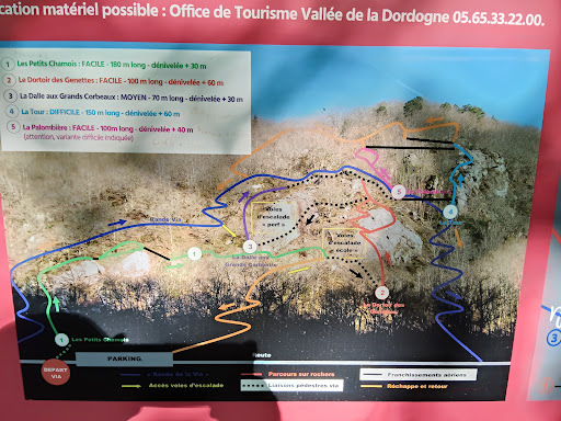 Via qui s'effectue dans un cadre forestier verdoyant, relaxant, avec une jolie vue sur la Dordogne đ Cette via d'initiation avec Ă©chappatoires comporte plusieurs peut convenir Ă tout public, sauf l'atelier 4. Elle est bien agrĂ©mentĂ©e de plusieurs ponts, d'une belle passerelle qui sont Ă©vitables au besoin đ 70% du parcours est en grandins ou en vires, ce qui s'apparentent Ă de la "randonnĂ©e cablĂ©e". Ma femme qui mesure moins d'1m60 et qui est moyennement musclĂ©e l'a terminĂ© sans problĂšme đ Je classerai l'atelier 4 "D-" simplement pour ses quelques barreaux en devers sympas qui pourraient causer des problĂšmes aux dĂ©butants sans accompagneurs compĂ©tants, le passage peut rĂ©clamer un peu de "mental", et de technique pour ceux qui ne sont pas habituĂ©s. Sinon, pour le reste du parcours, plutĂŽt "PD", il n'y a pas de grandes difficultĂ©s, pas de devers, pas besoin de beaucoup de "bras", ni de grandes techniques d'Ă©quilibres, beaucoup de contact rocher. Comme nous sommes habituĂ©s des vias, elle est nous a paru assez facile đ Le dĂ©part et l'arrivĂ©e de la via se trouvent sur le parking. Nous avons effectuĂ© les 400m en 0h40 (avec pauses, photos). Via exposĂ©e Sud-Est, donc intĂ©ressante en fin d'aprĂšs-midi en pĂ©riode...