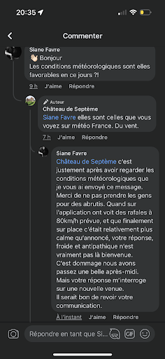 Nous nous sommes déplacés, et finalement oui il y’avait du vent mais c’était bcp plus calme que ce qui était annoncé. C’était sympa, bien que un peu court et un peu rapide, mais franchement nous avons tous passez un bon moment. Le lieu est vraiment beau. Mais en rentrant le soir, je suis tombé sur la réponse à mon commentaire sur Fb.. et la vraiment j’en regrette presque d’être venue, tellement la personne qui gère la communication est odieuse. C’est justement car du vent était annoncé, que je me suis permise d’envoyer un message pour savoir si sur place c’était aussi cata que météo France le prévoyait. Ça me fait mal au coeur d’être traitée de la sorte et de donner de l’argent à des personnes apparemment aigries. C’est dommage nous avions...