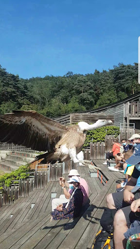 Petit parc dans les montagnes. Ne pas s'attendre à un parc comme peaugres ou st martin la pleine c'est vraiment petit mais c'est à faire au moins une fois si vous avez des enfants ou si vous êtes passionnés. Le lieu est très agréable, situé en forêt il y fait très frais le matin, donc prévoir des vestes et des baskets car pas mal de pentes à franchir. Il y à des airs de jeux pour les enfants (certains jeux dans l'obscurité reste néanmoins à éviter pour les touts petits, ma fille de 4 ans a eu très peur du chasseur et des "pièges", ce n'était pas la seule à sortir des jeux en pleure). Il y a peu de monde dans le parc surtout si vous arrivez le matin, et c'est vraiment agréable de pouvoir circuler dans le parc sans être collés. Les animations sont bien faite, et ponctuelles, on apprend pas mal de chose et encore plus si vous prenez l'initiative de poser des questions, les soigneurs vous répondrons avec plaisir. Le spectacle des rapaces est très bien également, pas déçus, ont voit les rapaces de très près (voir les photos qui sont non zoomés). Conseils se mettre tout en haut des gradins pour mieux les observer entre les vols, vous serez à 1 mètre d'eux. Et privilégier la séance de 14h pour avoir de l'ombre et ne pas avoir le soleil dans les yeux (gradin en face de vous quand vous rentrez), nous avons fait les 2 séances et celle de 16h était plus inconfortable à cause de la chaleur. Tout le personnel est très gentil et à votre écoute du début à la fin. Côté repas le chalet est vraiment propre et magnifique aussi bien de l'extérieur qu'a l'interieur, beaucoup de places assises et de l'espace entre les tables, côté nourriture ça pourrait être mieux je dirais, il n'y a pas beaucoup de choix et bien que ce soit du bio ça reste assez chère je trouve. Pour 2 personnes et une petite de 4 ans qui a juste pris une frite nous en avons eu pour 30e, repas qui comprenait 2 sandwichs froid, 3 frites 2 boisson et 2 dessert. Après dans tout les parc c'est pareil, le mieux étant d'emmener son pique-nique soit même et de manger sur place (comme par exemple dans les gradins des loups qui offre une très belle vue). Le parking reste à 2 pas du parc donc parfait si besoin de faire des aller retour pour aller récupérer à manger ou autre. Les toilettes sont propres, mais avait une forte odeur d'urine sur le coup des midi, nous y sommes retourné dans l'après midi et l'odeur n'était plus présente je suppose donc qu'ils sont nettoyés régulièrement. Je recommande ce parc, je lui met 4 etoiles à défaut de pouvoir mettre 4,5 sur 5. Merci à toute l'équipe pour votre accueil et...