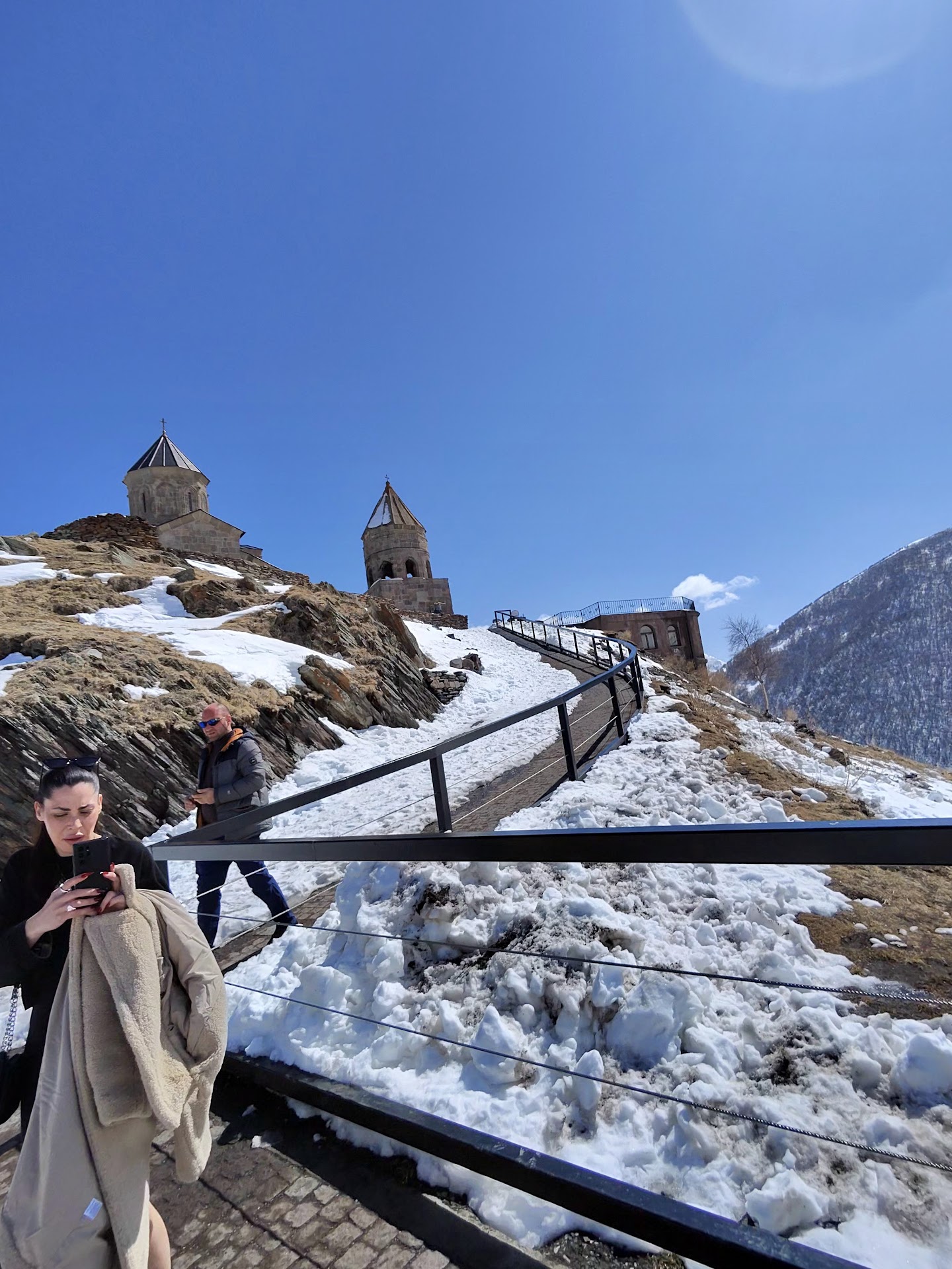 🏔️ Scenic Beauty & Weather: The views from the top are absolutely breathtaking, with snow-capped peaks all around and the red rooftops of Stepantsminda creating a postcard-perfect scene. Whether in summer or winter, the landscape is stunning! ❄️ It gets extremely cold at the top, even during the day—so make sure to wear full warm clothes, including gloves, caps, and jackets to stay comfortable.
