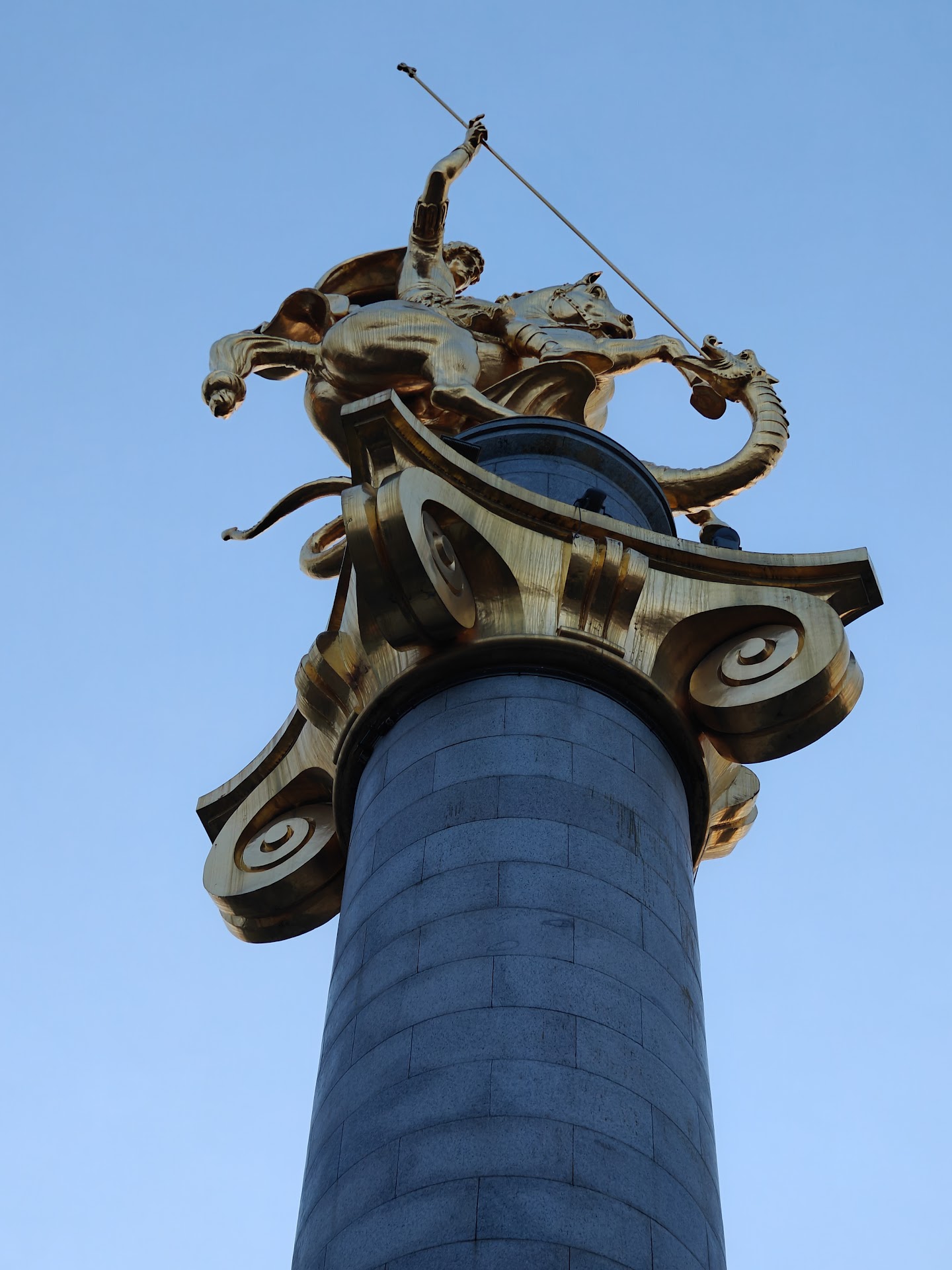 The Freedom Monument, commonly known as the St. George Statue, is a memorial located in Tbilisi, Georgia, dedicated to the freedom and independence of the Georgian nation. Unveiled in 2006 in Tbilisi's central square, the monument of granite and gold is 35 metres high and is easily spotted from any point of the city.