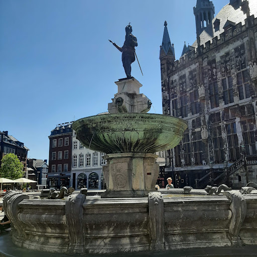 De Karlsbrunnen is een grote fontein, die op een heel prominente plaats in het centrum van de stad Aken staat: recht voor het stadhuis op de Markt. Hij wordt daarom ook wel 'Marktbrunnen' genoemd. De fontein is heel oud, en bestond al toen er in 1620 een bronzen beeld van Karel de Grote op werd geplaatst. Na een klein uitstapje naar Parijs (de Franse bezetters namen hem in de Napoleontische tijd als oorlogsbuit mee naar Parijs) werd het beeld in 1805 weer teruggegeven. Z'n laatste rit was maar kort, want in 1969 werd het originele beeld in de kroningszaal van het stadhuis geplaatst - uit voorzorg - en werd het op de fontein vervangen door een duplicaat. De prachtige bronzen schaal valt direct op, ook vanwege zijn historische inscripties. Hij is ruim 3,5 meter in doorsnee, en weegt maar liefst 6000 kilo. Er waren ervaren klokkengieters voor nodig om hem op dat formaat te kunnen maken, en dat waren Franz en Peter von Trier. Johann Couven, de Akense architect (zijn huis staat vlakbij en is als museum nog steeds te bezoeken), ontwierp in 1735 het hardstenen bekken waarop het geheel rust. Het kunstwerk valt door zijn grootte erg op, en laat zien dat Aken niet voor niets de Karlstadt is! Enkele jaren geleden werd de hele fontein opgeknapt, omdat de hardstenen sokkel...