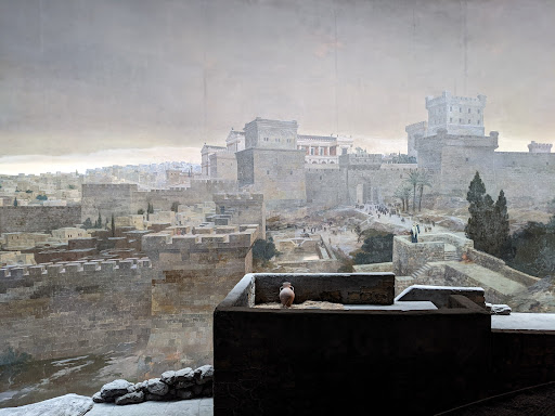 Über den spirituellen Wert mögen andere urteilen. Es handelt sich um ein 360-Grad-Panorama der Stadt Jerusalem mit Darstellung der Kreuzigung Jesu. Virtuose, absolut realistische Malerei aus der Zeit um 1900, die Rekonstruktion Jerusalems und des Tempels womöglich "bigger than live", aber absolut beeindruckend. Sozusagen ein gemalter Bibelfilm. Der Illusionismus wird verstärkt durch dreidimensionale Kulissen im Vordergrund. Seit einiger Zeit darf man auch hinter die Kulissen schauen, wobei man sieht, wie windig das Ganze wie eine Theaterkulisse aus ein paar Brettern zusammengenagelt ist (Türe zum Blick hinter die Kulissen am Fuß der Treppe beim Ausgang). Absolut sehenswerte, die 4,50 Euro (2021) wert. Es läuft eine etwas altmodische, 20-minütige Erläuterung des Geschehens als...