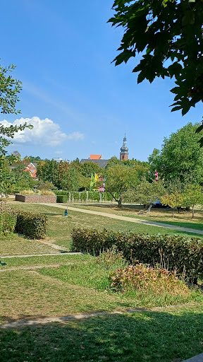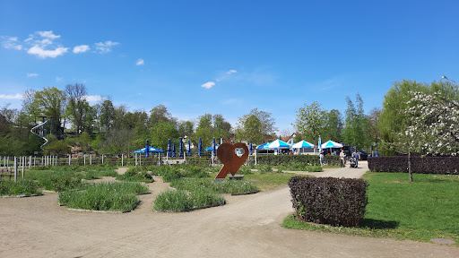 Es gibt dort einen kleinen Bach, indem die Kinder spielen können aber man muss Schuhe darin tragen wegen den Steinen. Dann gibt es mehrere Wiesenflächen im Park verteilt. Dort kann man es sich mit Decken hinsetzen oder am Bach, um in der Nähe der Kinder zu bleiben. Es gibt auch ei paar Hängematten verteilt zwischen kleinen Bäumen, die Schatten spenden. Wenn man Glück hat erwischt man eine freie. Dann gibt es einen großen Spielplatz, der aufgeteilt ist. Für die ganz kleinen Kinder, und die etwas größeren einen Kletterbereich und einer riesen großen Röhrenrutschbahn, die von einem Hügel herunter läuft. Dann gibt es auch einen kleinen Biergarten in der Mitte und hinter dem Biergarten ein Kräutergaten in dem man herumlaufen und sich alles anschauen kann. Vor dem Biergarten gibt es einen kleinen Rosengarten indem man auch heumlaufen und sich die Rosen anschauen kann. Auch gibt es dort mittendrin eine kleine, angelegte Anlage zum Füsse treten, wenn man Lust dazu hat, die aber im moment noch wegen Corona abgespert ist. So ist für jede Generation etwas da, was man genießen kann. Vom Park aus, am Bach entlang kann man auch sehr gut auf einem Weg spazieren gehen oder in die Stadt, nur ca. 5 Min zur...
