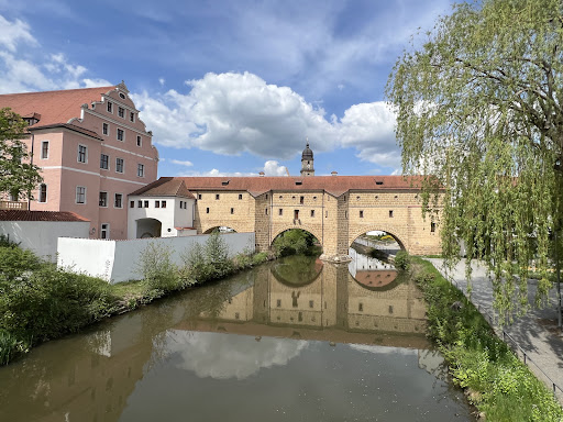 What makes it magical is its two semicircular arches, which—paired with their bright reflections in the Vils—form the appearance of giant spectacles hovering on the water. It connects the former Electoral Palace (Kurfürstliches Schloss) on one bank with the old armory (“Zeughaus”) on the other.