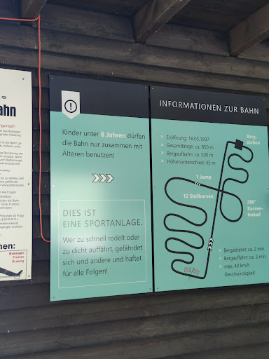 Read moreIch bewerte hier die Rodelbahn und nicht den Rest des Freizeitparks, da wir den aus zeitlichen Gründen nicht besucht haben. Die Rodelbahn macht Spaß und meine 8-jährige konnte sie auch super alleine meistern. Die komplette Abfahrt (und anschließende Hochfahrt) verläuft unter freien Himmel. Einerseits ist das gut, weil man freien Blick auf die Landschaft hat. Aber wieviel guckt man schon in die Ferne beim Rodeln... Wenn zumindest ein Teil der Bahn durch Bäume verlaufen würde, hätten wir sie noch schöner gefunden. Was wir aber mehr vermisst haben war Abwechslung, denn die Bahn ist fast im ganzen Verlauf eine Aneinanderreihung von Kurven, links, rechts, links, rechts... Sicherlich schön um Kurven zu üben, aber bei 12 Kurven etwas zu monoton für unseren Geschmack. Ein sehr positiver Aspekt zum Schluss: die Dame, die die Schlitten vergab hat immer auf die Bahn geschaut, um genug Abstand zwischen Rodlern zu gewährleisten. Erst dann gab sie das Start-Signal. Je nachdem wie schnell der Schlitten vor einem unterwegs war, hat man eben vor der Abfahrt etwas länger oder kürzer gewartet.