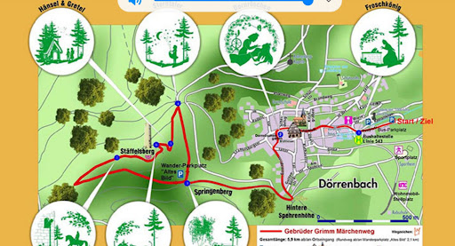 This is marked as the start of the Grimm Fairy Tale trail, but as you enter Dörrenbach, you will see an information sign and parking on the right side of the road. I would suggest parking at that spot since the starting point parking will quickly fill up.