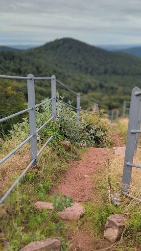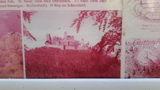 Read moreAbgesehen von den in den Buntsandstein gehauenen Treppen und Kammern ist von der ehemaligen Burganlage nicht mehr viel erhalten. Nachdem man jedoch die etwas ausgetretenen Stufen erstiegen und das Plateau des Sandsteinfelsens erreicht hat bietet sich eine wunderbare Aussicht über die bewaldeten Hügel des Pfälzer Waldes.