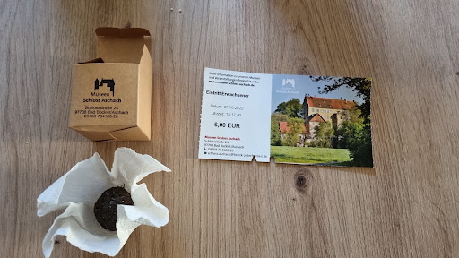 Ich hatte schon viele Jahre vor das Schloss endlich mal zu besuchen, jetzt hatte es endlich geklappt. Wir sind gegen 12.30 Uhr angekommen und haben in der Schlossstube zu Mittag gegessen, das hatten wir so geplant da das Museum erst um 14 Uhr öffnet. Insgesamt sind auf Schloss Aschach 3 Museen beherbergt. Das Museum der Grafen von Luxburg, ein Heimatmuseum und ein Schulmuseum. Man erwirbt die Eintrittskarten und kann alle 3 Museen besuchen. Sollte es einem Zu viel werden bei so viel Kultur hat mal bis Ende der Saison Zeit alle Museen zu besuchen. In jedem Haus wird die Eintrittskarte mit einem anderen Locher entwertet, so das das Personal genau weiß wo man noch hin kann. In jedem Bereich erhält man eine genaue Erklärung zu den Verhaltensregeln, war gerade im Hauptgebäude wichtig. Auch sind die Dame und Herren sehr nett und geben bereitwillig und kompetent Auskunft. Was ich etwas schade fand, sind die Öffnungszeiten. Da wir nur bis 17 Uhr für alle Musseen Zeit hatten, war es uns nicht möglich noch das Schulmuseeum anzuschauen. Was ich aber schön fand... als ich im Hauptgebäude das Museum der Grafen von Luxburg bewertet bekam ich eine kleine Aufmerksamkeit als Dankeschön. Leider habe ich nicht erfahren um was es...