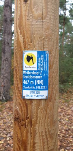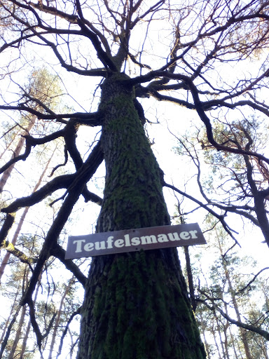 Große Felsformation, ideal zum Versteckspielen und vorsichtigem Kraxeln für die Kinder. Zwischen der 'Teufelsmauer' und dem Fernmeldeturm sollte man sich auch den wunderbar alten Baum am Wegesrand anschauen. --- Leider wird der 'Ganerbenweg' auf Google Maps in diesem Gebiet nicht...