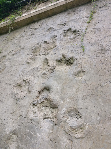 Durch tektonische Kräfte wurde an dieser Stelle eine Sandsteinplatte fast in senkrechte Stellung gebracht. Auf einer Länge von etwa 10 Metern ragt sie fast 6 Meter in die Höhe. Auf ihr haben sich Fährten von mehreren Sauriern verewigt. Diese Fährten werden auf daneben angebrachten Schautafeln ausführlich erläutert. Auf ihnen erfährt der Besucher beispielsweise, dass es sich bei den sichtbaren Fährten um die Spuren von mehreren kleineren Sauropoden (Pflanzenfresser) und zwei großen Theropoden (Fleischfresser) handelt. Wichtig und interessant fand ich auch weitere genauere Informationen über diese beiden Saurier-Arten.