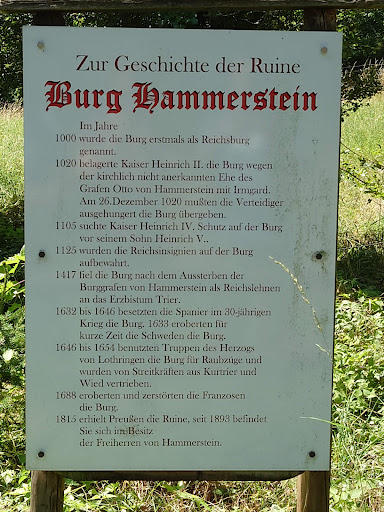 Read moreBurg Hammerstein – absolut sehenswert! Die Burg Hammerstein ist definitiv einen Besuch wert. Sie liegt wunderbar erreichbar, egal ob man zu Fuß oder mit dem Fahrrad unterwegs ist. Oben angekommen wird man mit einer großartigen Aussicht belohnt, die weit ins Umland reicht. Die Burganlage selbst ist beeindruckend groß und lädt dazu ein, sie in Ruhe zu erkunden. Ein ideales Ausflugsziel für alle, die Geschichte, Natur und schöne...