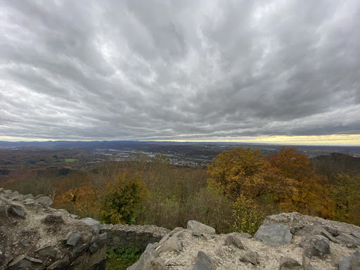 Die Burgruine selbst war schön und teilweise restauriert sowie mit 3 Infotafeln an den Mauerresten versehen sodass man sich gut vorstellen konnte wie es hier einmal ausgesehen hat. Spektakulär war die Aussicht. Unglaublich wie weit man sehen konnte und dabei hatten wir nicht gerade das beste Wetter erwischt, es war stark bewölkt und hat ein wenig genieselt zwischendurch. In der Burgruine selbst steht am höchsten Aussichtspunkt ein Baum mit einer Sitzbank, dort erhält man den besten Blick auf die Umgebung und kann sich vom Aufstieg erholen. Denn ganz egal für welchen Aufstieg man sich auch entscheidet, diese grandiose Aussicht ist jede Mühe wert. Teilweise weht aufgrund der exponierten Lage ein starker Wind. Vom Restaurant Löwenburg bis zur Burgruine sind es nur etwa 600 Meter, der Weg ist allerdings ziemlich steil. An sich kein Problem, wir hatten allerdings den Fehler gemacht auf der Löwenburg Straße in Höhe der Hausnummer 3 zu parken und sind dann der Beschilderung gefolgt mit dem Hinweis 190 Minuten Fußweg zur Burgruine. Wie sich dann herausstellte war das der steilste Wanderweg. Wir als "Flachland-Tiroler", schon etwas älter und eher der Typ Spaziergänger waren damit fast ein klein wenig überfordert. Mit Pausen die wir dringend benötigt haben um wieder etwas Luft zu bekommen waren wir mehr als 2 Stunden unterwegs. Der Weg ist teilweise nur etwas über einen halben Meter breit mit steil abfallendem Hang auf der linken Seite und führt durch den Wald. Entsprechend war natürlich auch die Bodenbeschaffenheit. Waldboden mit Naturgestein und feuchtem Laub und Baumwurzeln. Nur in Höhe der Schutzhütte hat man einen schönen Blick auf die Umgebung. Dieser Weg ist wohl auch bei Mountainbikern sehr beliebt. Uns sind jedenfalls mehrere begegnet. Beim Rückweg haben wir uns daher auf die Google-Navigation verlassen und sind einem anderen Weg gefolgt der aber ebenfalls steil abfallend und mit Geröllsplit versehen war. Für diesen Weg zurück zum Auto haben wir etwas weniger als 1 Stunde gebraucht. Es gibt aber wohl noch einen einfachen und teilweise asphaltierten Weg der ohne große Steigung direkt zum Restaurant führt (siehe Homepage des Restaurant). So etwa ab 11 Uhr hat es sich auch ziemlich belebt, wer also die Ruhe sucht und die Ruine sowie die Aussicht für sich alleine genießen möchte sollte sich frühzeitig auf den Weg machen. Wie auch immer und wozu man sich auch entscheidet, die atemberaubende Aussicht ist nicht zu toppen. Man hat über zig Kilometer eine unglaubliche Weitsicht. Einen so schönen und romantischen Blick auf den Rhein findet man eher selten. Bei dem Anblick fragt man sich automatisch wie es überhaupt möglich ist dass noch Grenzen existieren. Wir waren jedenfalls absolut begeistert und können es nur empfehlen einmal die Ruine mit dem sensationellen Ausblick...