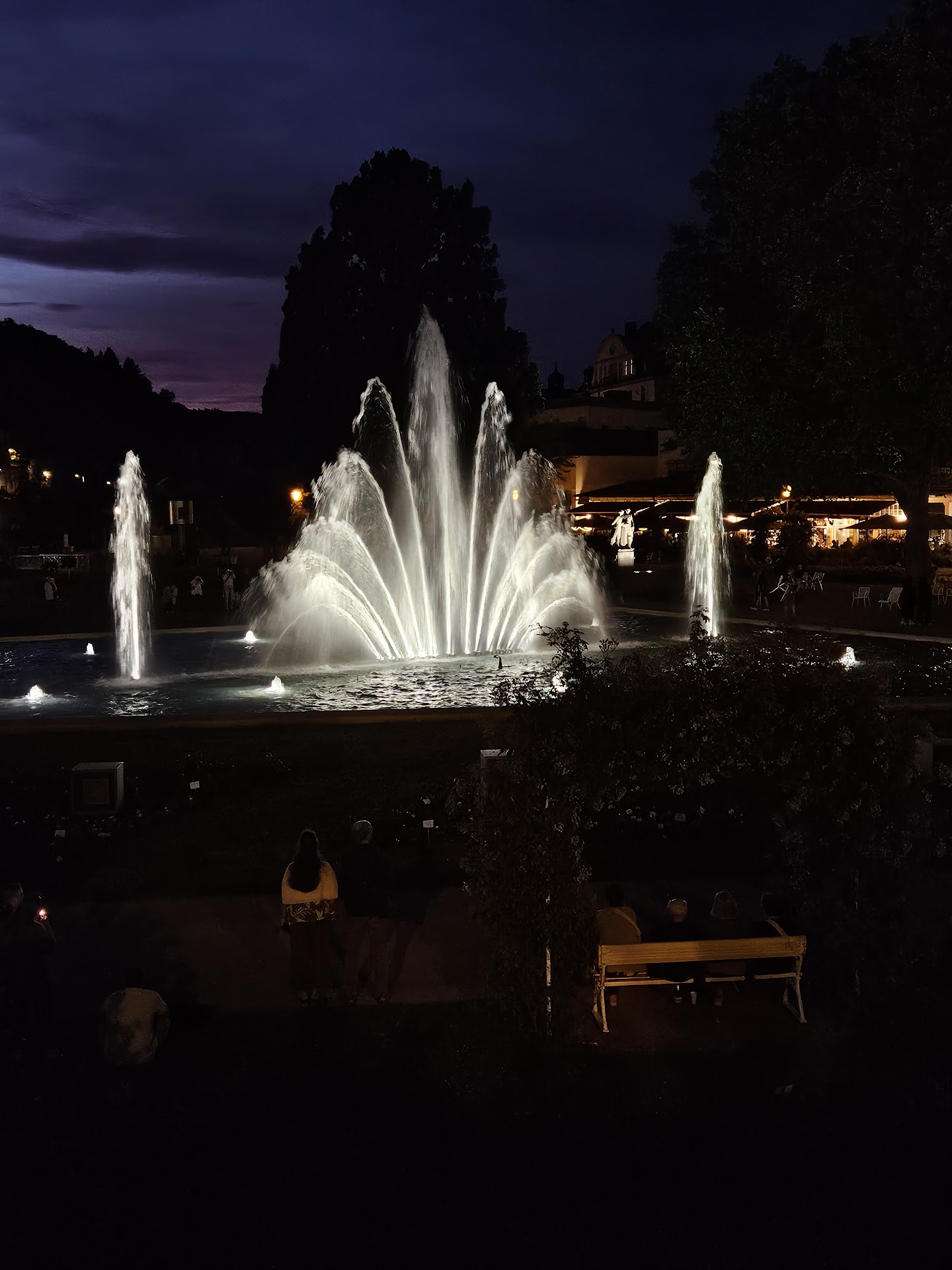 Im Gegensatz zum Kurgarten, der einst den Kurgästen vorbehalten war, wurde das sogenannte „Rosarium“ für die Bürger angelegt. Heute erfreuen sich hier Gäste und Einwohner gemeinsam an den gut 125 Rosensorten und etwa 10 000 Stöcken. Ihnen verdankt Bad Kissingen das Prädikat „Rosenstadt“. Zur Blütezeit ab dem Frühsommer bieten sie einen überwältigenden Anblick, den Sie am besten bei einem Spaziergang oder von einem der Cafés oder Eisdielen an der Promenade aus genießen können. Ebenfalls im Rosengarten befindet sich ein Denkmal für die Entdecker der Rakoczy-Quelle Balthasar Neumann und Georg Anton Boxberger – sowie ein ganz besonderes Highlight: Deutschlands einziger Multimedia-Brunnen. Hier erleben Sie täglich zauberhafte musikalische Wasserchoreografien sowie regelmäßige Beamer-Shows, bei denen eigens produzierte Filme und Shows auf eine Leinwand aus Wassertröpfchen projiziert werden.
