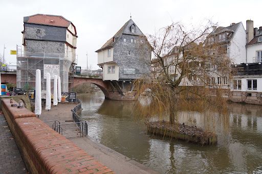 The bridge houses are built in timber frame construction and stand on the Old Nahe Bridge. It was built as a stone bridge in 1300. On eight pillars it bridged the two arms of the Nahe that flow through the city. Only the bridge over the Mühlenkanal has been preserved in its historical form as a pillar bridge. The Old Nahe Bridge was the intersection of two highways and at that time also served as part of the city wall ring. A very...