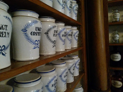 Es handelt sich um eine funktionstüchtige Apotheke mit den Materialien aus dem 19. und 20. Jahrhundert. Die Regale stammen noch aus dem Jahr 1806. In vielen Schubläden und Glaskästen sahen wir alte Medikamentenbehältnisse und Utensilien.
