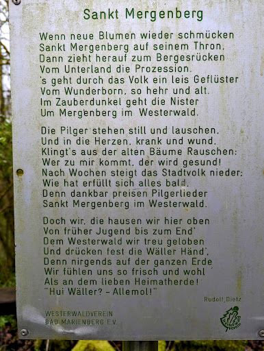 Wenn neue Blumen wieder schmücken Sankt Mergenberg auf seinem Thron. Dann zieht herauf zum Bergesrücken Vom Unterland die Prozession. 's geht durch das Volk ein leis Geflüster Vom Wunderborn, so hehr und alt. Im Zauberdunkel geht die Nister Um Mergenberg im Westerwald.