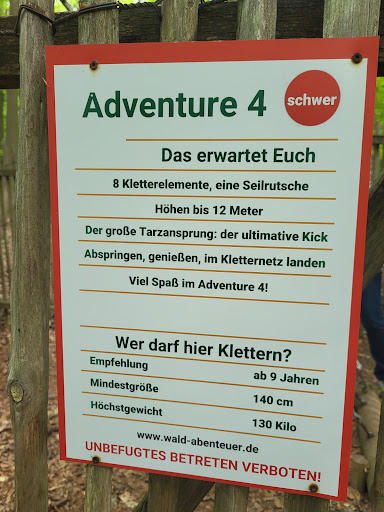 Wahrscheinlich hätte ich 4 Sterne vergeben, aber nach dem Vorfall heute sind mir ein paar Sachen aufgefallen die meines achtens verbesserungswürdig sind. -Möchte man zur Anmeldung muss man über eine Wiese laufen. Da sind morgens danach schon mal die Schuhe nass. -Wir hatten Kinderklettern gebucht. Um dorthin zu gelangen muss man ein paar hundert Meter einen steilen Weg mit vielen Wurzeln hochgehen. Mein Vater mit seinen 75 Jahren war sehr begeistert gewesen. -Beim Kinderklettern gibt es 2 Strecken und eine lange Seilrutsche. Diese Rutschstrecke ist sehr überschaubar und man sieht, wenn jemand aus dem Gefahrenbereich (also das Rutschende) heraus ist. Das ist bei der Seilrutsche bei Strecke 1 nicht so. Da ragen Äste in das Sichtfeld (siehe mein Foto). So kann man nicht so gut erkennen, ob derjenige, der vor einem gerutscht ist, aus dem Gefahrenbereich heraus ist. -Ich mit meinen 90 Kilo habe bei der Seilrutsche mit meinen Hintern gebremst. Wäre schön wenn das mal jemand vorher gesagt hätte. Mein Sohn war erst 5 und so musste ich als Begleitperson mit. -Kinder die zu leicht sind rutschen nicht bis zum Ende der Seilrutsche und haben so Probleme diese zu verlassen. Das hatte ich bei meinem Sohn (110cm) gesehen. Der kam da gerade so mit den Füßen auf den Boden. -Strecke 2 konnten mir nicht machen da das 2te Element (diese U Seile) schon zu schwer gewesen ist. Und das ging nicht nur uns so. Andere Kinder mussten auch zurück gehen weil sie ein Element nicht gemeistert bekamen. Die Strecke 1 war schon sehr sportlich, aber wurde geschafft. Ich behaupte aber mal, das man hier das Alter ruhig auf 6 Jahre für alle Strecken hätte hoch setzen können. -Was aber gar nicht geht ist, dass die Enden von den Kinder Seilrutschen ca. 100 Metern im Wald aufhören. Und nicht in Sichtweite vom Personal oder Erwachsenen. So bekommt man kaum (oder zu spät) mit falls ein Kind ggf. in ein anderes reinkracht. Muss nicht, kann aber alles mal passieren. -Die Kinder dürfen keine eigene Helme tragen sondern nur die vom Kletterpark. Erwachsene müssen als Begleitperson keine Helme tragen. Fand ich nicht so gut. -Das Personal ist aber freundlich gewesen. Zum Essen gibt es aber so gut wie nichts zu kaufen dort.
