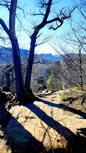 Auf dem Gipfelplateau sind kaum noch Reste der Ruine zu sehen. Nur noch Balkenlager, Mauerreste, Stufen und Felszeichnungen sind vorhanden. Aber die Aussicht ist noch einmal schön: Im Norden erblickt man in der Ferne die Dörfer Lichtenhain und Mittelndorf, im Osten auf die Lorenzsteine und im Süden und Südwesten die Schrammsteine und Affensteine mit dem Kleinen Winterberg und...