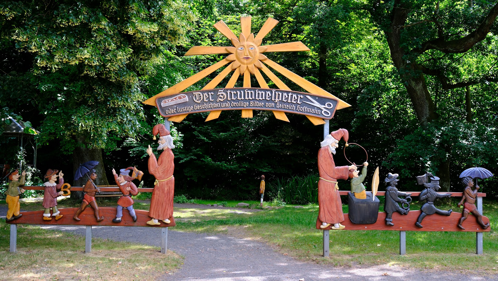 Eine kleine bunte Freiluftausstellung mit den Bildern und Motiven der sehr alten Bilderbuchgeschichte "Der Struwwelpeter" von Heinrich Hoffmann, die wohl als Geschenk für den eigenen Sohn zu Weihnachten 1844 verfasst hatte. In seinen Lebenserinnerungen schrieb Hoffmann: „Ja, ich kann mit Befriedigung sagen, der Schlingel hat sich die Welt erobert, ganz friedlich, ohne Blutvergießen, und die bösen Buben sind weiter auf der Erde herumgekommen als ich; ich habe gehört, dass man ihnen in Nord- und Südamerika, ja am Kap der guten Hoffnung, in Indien und Australien...
