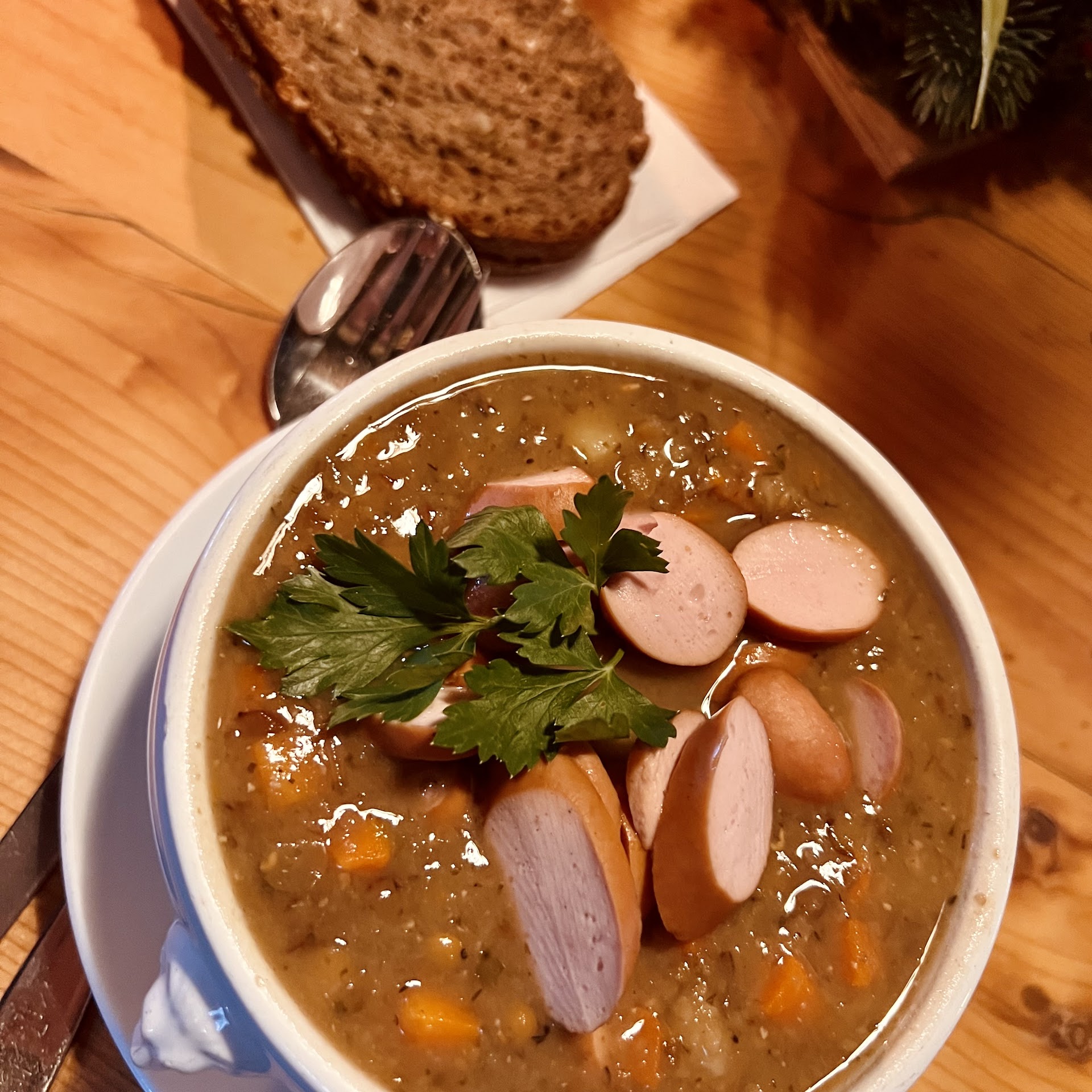 Went here as the destination after a mild hike. We weren’t fortunate with the weather but could imagine the view must be great with the sun out. We went inside. It is cash only! Make sure to bring some funds. The food around us looked great and we liked the lens soup a lot! Unfortunately we cannot recommend the Kaiserschmarren here though - we were already suspicious as it was ready after 3 Minutes (not freshly made) and it does not come with usual perks at that (high) price point like raisins, almond leaves or some glazed honey… Otherwise very nice...