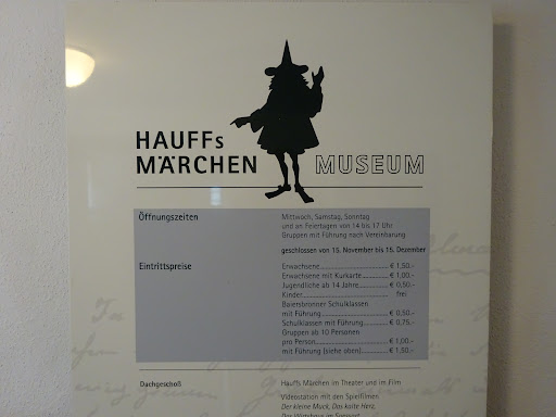 Read moreHübsches, kleines Museum, das einen kurzen Abstecher lohnt. Rund um das Kunstmärchen „Das kalte Herz“ und seinen Autor Wilhelm Hauff wird über das Leben im Schwarzwald und das Werk des Autors informiert. Zu allen Erzählungen des Autors gibt es eine kurze Inhaltsangabe. Weiter sind – wie in einer Bücherei – unterschiedliche Ausgaben der Erzählungen und Kunstmärchen ausgestellt. Im Obergeschoss wird ein Zusammenschnitt des Films „Das kalte...