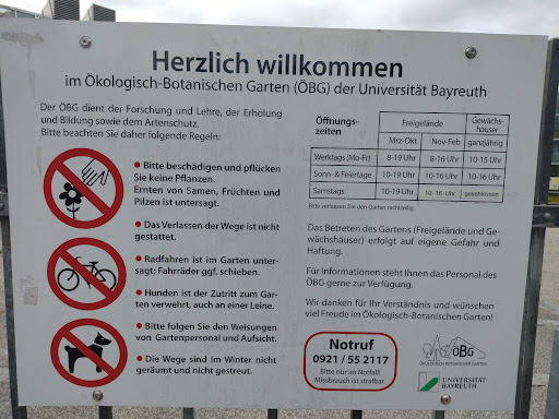 Read moreDer Ökologisch-Botanische Garten in Bayreuth erstreckt sich auf einer Fläche von über 15 Hektar und dient bei freiem Eintritt sowohl der Forschung als auch der Bildung. Auch für interessierte Laien und für Erholung suchende Besucher wird viel getan. Hier wachsen Pflanzen aus verschiedenen Klimazonen und Lebensräumen der Erde, darunter Steppen, Wälder, Wüsten und Feuchtgebiete. Besonders hervorzuheben sind die tropischen Gewächshäuser, der beheizte Wasserpflanzenpool im Freien, 1000e von Kübelpflanzen , die im Frühjahr ins Freigelände umziehen, die Prärie und der große Nutzpflanzengarten. Der Garten bietet Besuchern einen Einblick in die Pflanzenvielfalt und ökologische Zusammenhänge weltweit. Regelmäßige Hier kann man ohne Anstrengung einen gesamten Tag verbringen und alle paar Wochen wieder kommen. Führungen und Veranstaltungen fördern das Umweltbewusstsein und machen den Garten zu einem wichtigen Ort für Naturinteressierte und Wissenschaftler. Zudem dient er der Universität Bayreuth als lebendiges Freilandlabor mit verschiedenen Versuchen zu Bauphysik , Neophyten, Klimawandel und Düngung. Die beiden Eingänge werden pünktlich abgeschlossen, in der warmen Jahreszeit um 19 Uhr. Vom Hauptbahnhof läuft man zum ZOH und fährt von dort zur Haltestelle Uni Verwaltung. Kostenlose Parkmöglichkeit sind...