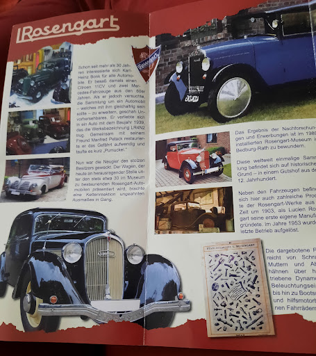 Read moreIm Prospekt zum Rosengart-Museum (Geschichte - Technik - Automobile) steht, mit "Pumuckel" fing alles an. Doch einen Propekt braucht es eigentlich nicht. Herr Bonk berichtet gern in seinen Führungen über sein Leben mit Lucien Rosengart. Die Erzählungen sind so lebendig und lassen erkennen: Hier spricht ein Mensch mit Herz. Über 40 Jahre Sammelleidenschaft rund um Lucien Rosengart. Das Museum ist so voll mit vielen Kleinigkeiten. Bei einem Besuch bleibt es wohl nicht. Am Wochenende gibt's auch Frühstück auf Vorbestellung im Biergarten. Ach übrigens neben der Kasse liegt fast unscheinbar ein Buch zum Rosengart-Museum. Ich kann nur empfehlen es mitzunehmen. Selten habe ich ein Buch gelesen, in dem technische Details, Industriegeschichte und menschliche Motivation so gelungen in einer leichten Sprache gemischt werden. Hier weiß der Autor, wovon er spricht und kann seine Leidenschaft mit dem Leser teilen. Ein Rosengart-Museums-Besuch...