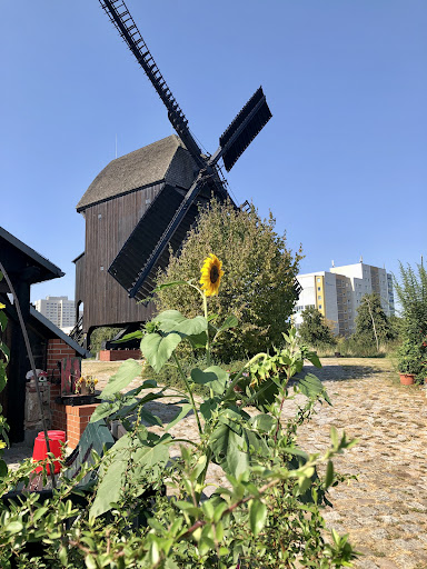 Ein Wanderführer unseres Vereins hatte eine Führung für eine kleine Gruppe organisiert. Der Müller hieß uns herzlich willkommen und erklärte uns den Aufbau und die Funktion der Mühle. Bei einer Führung durch die Mühle wurde uns wieder bewusst, wie viel Fleiß und Arbeit in einem "echten" Getreideprodukt steckt. Leider hatten wir die Führung an einem Mittwoch und der Ofen zum Brotbacken wird immer donnerstags angeheizt. Ich bin also am nächsten Tag gleich 14.00 Uhr wieder an der Mühle gewesen und sah schon die leckeren Brote. Die Entscheidung fiel nicht leicht: Zwiebelbrot (ist mein Favorit), Dinkelbrot, Vollkornbrot... Ich werde jetzt öfter kommen! Dank an den Müller (und alle Helfer vom Mühlenverein), dass ihr die Mühle als Attraktion und Wahrzeichen von Alt-Marzahn wieder attraktiv gemacht habt. Auch das Gelände um die Mühle ist liebevoll bepflanzt und es grünt und blüht rundum. Die Kürbisse...