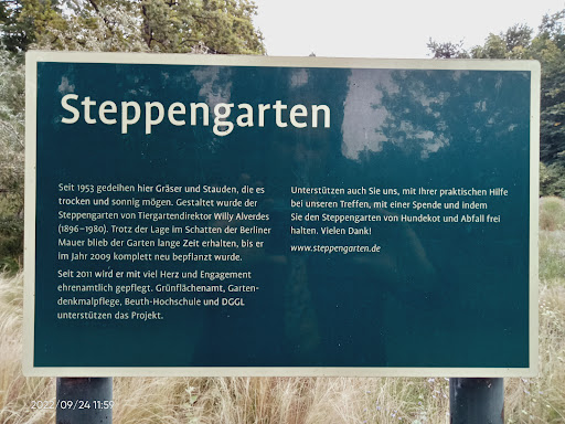Der Steppengarten im Berliner Tiergarten beherbergt seit 1953 eine unglaubliche Vielfalt an heimischen Wiesen-, Auen-, Heiden- und Küstenpflanzen. Er trägt wesentlich zur Insektenvielfalt in dem sonst pflanzlich von tierischer Seite gesehen eher öden Flora des Tiergartens bei und wird ehrenamtlich gepflegt. Neben den von den vom Gründer Willy Alverdes 1953 gewählten Rosenpflanzen befinden sich auch seltenere Steppen- und Tundraarten wie Dorniger Hauhechel, Strandroggen, Elfenbeindistel oder Kaukasus-Katzenminzen, die an den hiesigen nährstoffarmen, sandigen Boden gewöhnt sind. Darunter sind die Gräser Festuca mairei , Panicum virgatum sog. "Emerald Chief", Sorghastrum nutans sog. "Indian Steel", Sporobolus heterolepis sog. "Winsconsin Strain", Sporobolus airoides und Stipa tenuissima, die nach Anlaufschwierigkeiten inzwischen gut wachsen und den Gärtnern und Besuchern viel Freude machen. Bewährt haben sich auch die Stauden der ersten Stunde Erodium manescavii, Gaura lindheimeri „Summer Brize“, Helenium autumnale und Helenium autumnale 'Helena Red Shades', Knautia macedonica und Scabiosa ochroleuca. Verbena hastata „Pink Spires“. Die Gärtner haben sich mittels eines Kaninchenzauns auch mit der ansässigen Kaninchenpopulation auf eine Bepflanzung "geeinigt", die letztere nicht mehr durch den Garten marodierend in Festgelagen niedermachen. Die Bepflanzung kommt (außer bei Neubepflanzung und in Dürreperioden) ohne Bewässerung aus. Ehrenamtliche Helfer, die die Arten für die Nachwelt erhalten wollen, sind willkommen und dürfen sich gerne melden. Die Stadt blieb bislang eher zurückhaltend und es hängt vom Einsatz freiwilliger Helfer ab, ob die Fläche nicht irgendwann dem großen amtlichen Rasenmäher zum Opfer fällt. Der Garten ist auch ein guter Platz Teenager zum Einsatz zu bringen, die die Nasen zuviel auf dem...