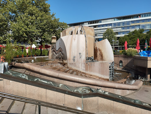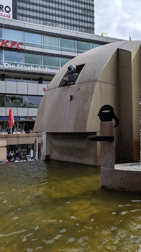 The Weltkugelbrunnen or World Fountain is a fountain in Breitscheidplatz. The centrepiece is red granite dome like structure with sections cut out. Dotted around the sculpture are scenes of everyday life and a mixture of random animals and people using a mix of surreal and modernist style. Water cascades down town sets of spiral staircases around the dome.