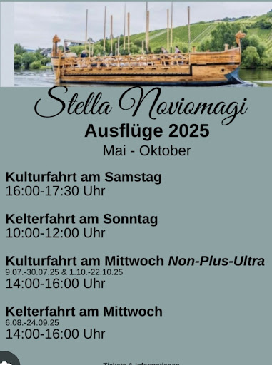 Ein Erlebnis für die ganze Familie, absolut entspannt und gemütlich geht es mit dem Weinschiff Stella Noviomagi über die Mosel, wir hatten die 1,5h Tour gebucht, die sehr unterhaltsam/ informativ und leider viel zu schnell vorbei gegangen ist. Die Tickets haben wir online gekauft, ein kostenloser Parkplatz ist am Anleger ( Neumagen-Dhron ). Auf dem Weinschiff gibt es keine Sanitäranlagen, also vor gehen. Auf dem Schiff gibt es Getränke wie Wein und Wasser zu einem Einheitspreis von 5€, aber nichts zu Essen, das sollte aber 1,5h auszuhalten sein. Für Menschen mit körperlichen Behinderungen ist das Erlebnis nur bedingt zu empfehlen, es ist ratsam, sich vorher zu...