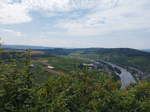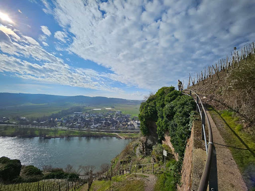 Read moreWer klettern, doch nicht gleich in die Berge, will, wer Lust auf unwegsames Gelände hat, wer das kleine Abenteuer sucht ohne sich einem unkalkulierbaren Risiko aussetzen will, der ist hier genau richtig. Ein steiler Anstieg durch die Weinberge über Schieferboden, Fels, Leitern und teilweise gehauene Stufen, an der Mosel mit gut 100 Metern über dem Meeresspiegel beginnend, endet mit einer kollosalen Aussicht über das Moseltal 200 Meter höher. Dieser Aufstieg, auf einer Strecke von etwa 1400 Metern, ist anstrengend aber er lohnt sich wirklich. Auf dieser kurzen Etappe kann man erspüren wie hart die Arbeit im Wingert war und immer noch ist. Jahrhunderte wurde die Arbeit ausschließlich manuel erledigt, ein Steillagenwein, bekommt einen ganz neuen Wert und die kommenden Flaschen werden ganz bewusst und voller Demut genossen. Auf dem Weg, beginnend an einer aus dem dritten Jahrhundert stammenden römischen Kelteranlage, unter- und überquert man die Schienen der Monorail, einer Art Eisenbahn die dem Winzer die Arbeit heute erheblich erleichtert. Vorbei an Kunstobjekten, einem kleinen Heiligenhäuschen schlängelt sich der Pfad immer weiter empor. Mit jedem zurückgelegten Meter steigt nicht nur der Puls, nein auch der atemberaubende Ausblick. Geländer, in den Fels verankerte Seile und Stufen erleichtern dem Mutigen den Aufstieg. Der Weg ist seit kurzem sehr gut ausgeschildert, es gibt hier und da mal eine Ruhebank, doch im Großen und Ganzen will er erlaufen werden. Etwa auf der Hälfte des Weges gibt es ein Felsplateau mit Bänken und Tischen wo man ausgiebig verschnaufen und sich auf Schiefersteinchen...