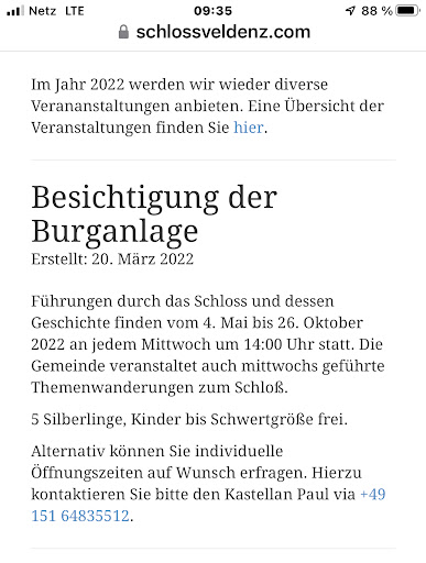 Came here on a late May afternoon with a friend and our kids (ages six, five, three, and 1.5 years). All I knew (based on reviews and website) was that we would have to pay for tickets for anyone larger than a sword and that the tour started at 2, and that we might have to walk up a steep hill to get to the castle but that was it. We used Google maps to get there, which brought us to a small street in a tiny village without any clear path and told me “you have arrived”. I asked someone who lived in one of the houses there and he said to keep going, bear left after the homes ended, and that there would be a small parking lot on the left. He was right, and we parked there and followed signs for the castle (“schloss”). It was about a 10 minute walk at children’s pace, with me wearing the baby, and towards the end having the three year old sitting on my shoulders - it was somewhat steep, not the worst we’ve encountered but I was short of breath carrying both kids. We found out we could have kept on driving and pulled up directly in front of the castle. The tour had about 20 people in it and there were 3-4 cars parked close wi the 3-4 potential spots left along the road. The tour had already started as we were 5-10 minutes late, and was done only in German, however the caretaker of the property was incredibly kind and speaks German, French, and English. He gave us a Brief overview of what the tour guide was saying and a map after buying tickets from him for five euros just for us two adults. He said we could roam at our leisure, which is basically what we ended up doing as we couldn’t understand the tour being given in Germany only. From what I could tell, the tour guide was humorous as there were many times that the entire group was laughing. I would guess the tour took roughly an hour. There were many places to explore, and a few furnished and decorated rooms which really lets you imagine what it was like to live in those times. The castle itself is in wonderful condition, and dates back to the 1100s. There is a good amount of history you can read up on on their website online. We stayed there just over two hours exploring. There are plenty of benches and tables to have a snack if you bring food with you and they have water and wine available at the end of the tour in the knights hall. The view from the tallest tower was incredible, though it was a little nerve-racking climbing up there wearing the baby and with a three-year-old. Five and six-year-olds had no problem. There are bathrooms, which are open and require you to go down one flight of stairs once you’re in the castle. Overall, I was so happy to have made the hour long trek to this castle and was more than impressed with the staff and facilities. I highly recommend it to anyone, even if you don’t speak German as it is fun to explore regardless and they did their best to accommodate us despite our language limitation. They also shot the cannon at the start of the tour; we were still down in the parking lot when we heard it, and then they launched the catapult with nothing in it, both being such a cool features of the tour. The local village was adorable and awesome drive and had a few restaurants open that looked like they would have been wonderful spots to stop for a meal or beverage....