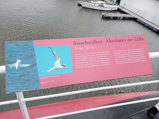 Dann noch Informationen im Motorenraum über die Antriebstechnik bekommen, sehr schön gestaltete Ausstellung über Flora und Fauna der Insel, fest installierte Infotafeln mit durchaus kontroversen Argumenten zur Land- und Seenutzung - ab dem Schulalter bis zum "lebenslangen Lernen" also einen Besuch wert. Dann noch die Vorstellung, auf dem Schiff einen wesentlichen Teil seines Lebens zu verbringen, inklusive laufender akustischer Signale... Da haben es ja die "BuFDis", die heute ein Jahr ihres Lebens diesem Kleinod der jüngeren Seefahrtsgeschichte widmen, ohne Wellen im Hafen...