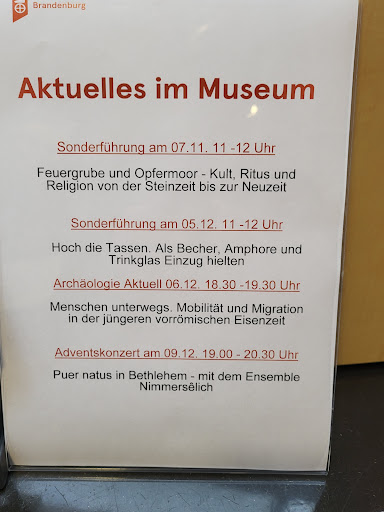 Read moreThe visitor will be offered more than 10,000 exhibits on an area of approximately 2,000 square meters. The exhibits date from the Stone Age, the Bronze and Iron Age, the Migration Period, the Slavs, the Middle Ages and modern times. Among the oldest finds of this include in addition to hand axes and arrowheads also one of the oldest textiles in the world, the Trägeretz from Friesack, Neolithic gold rings from a funerary burial and the preserved skull of a successful trepanation (surgical opening...