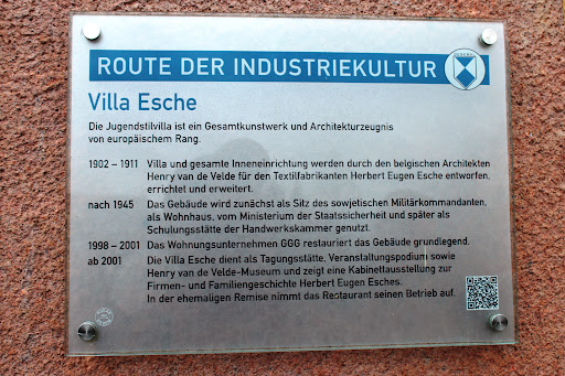 Read moreIch und meine Frau wollten am 13.08.23 die Villa Esche besichtigen da wir aber einen kleinen Hund dabei hatten haben wir es nicht einmal bis zum Eingang geschafft da uns eine Mitarbeiterin mit Kopftuch ankommen sah ist sie schnell ins Haus gelaufen und darauf kam eine andere Mitarbeiterin aus dem Gebäude und stellte sich uns in den Weg und sagte uns unmissverständlich das wir den Hund nicht mit ins Haus nehmen dürfen und einer von uns in den Garten gehen soll da würden bestimmt Sitzgelegenheiten sein wo man warten kann es war eine total verdreckte Bank im Garten worauf ich darauf lieber mit meinem Hund zum Auto ging und auf meine Frau wartete bis sie wieder kam ich habe dann verzichtet trotz Ticket mir das Haus anzuschauen ich werde auch nicht wieder so schnell auch nur in die Nähe zu fahren wenn man so angepatzt wird vergeht einem der ganze Tag trotzdem wünsche ich dem Betreiber alles gute aber mich und meine Freunde werden sie nie mehr dort sehen schade...