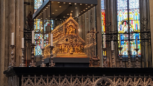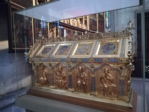 The Epiphany Shrine in Cologne Cathedral is a reliquary made as a goldsmith's work dating from the late 12th century. It serves to store the bones brought to Cologne by Archbishop Rainald von Dassel in 1164, who are revered in the Roman Catholic Church as the relics of the Magi. In addition, the shrine contains the bones of Gregory of Spoleto and other parts that are no longer attributed, but were attributed to the saints Felix and Nabor. The shrine, made between 1190 and 1225 by the goldsmith Nicholas de Verdun, is considered the largest and most artistically sophisticated reliquary preserved from the Middle Ages. It is built on two levels in the form of a basilica and decorated with golden figures, gemstone jewelry, gems, cameos and enamel melts that illustrate the Christian history of salvation from the beginnings of the Old Testament to the...