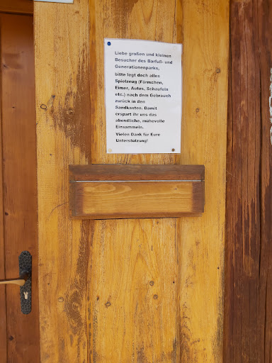 Barfuß Bereiche, Wasser- Spielmöglichkeiten, Schaukel, Rutsche, Theaterbühne und Platt zum Boel, Bänke in der Sonne und im Schatten, Sandspielkasten ist überdacht, Insektenhotel und Musikgerät?