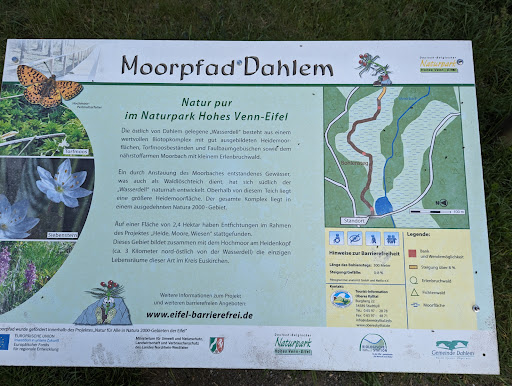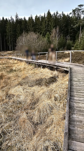 Read moreDas Moor ist relativ klein aber sicher interessant. Wir wollten es als Ausgang für eine Wanderung nutzen. Ab dem Parkplatz am Moor sind zwei Runden ausgeschildert: der kleine und der große Moorpfad. Da dort keine Karte die Wege ausschildert, sind wir davon augegangen, dass der große Moorpfad eine größere Runde 8,5 km ist und dabei den kleinen Moorpfad 1,5km beinhaltet. Wir sind also der Ausschilderung vom Parkplatz links in den Wald gefolgt. Der erste Abschnitt geht auf sehr breiten Waldwegen durch den Fichtenwald, vorbei an einer alten Römerstrasse. Später biegt er dann auf einen kleineren Pfad ab, der entlang von einem Bach führt, dieser geht dann an Bahngleisen entlang in den Ort und man muss durch den kompletten Ort laufen, um schließlichlich wieder am Parkplatz zu landen. Dann erst haben wir festgestellt, dass man den kleinen Moorpfad extra laufen muss. Das hätte man wesentlich besser planen können. Man sollte also erst über den Bohlenweg laufen, dann am Ende links abbiegen und dann erst auf den großen Pfad nach rechts einbiegen. Insgesamt nur eine mittelmäßige Wanderung, da die Anteil am Bahngleis und im Ort...