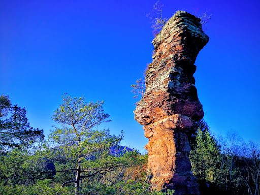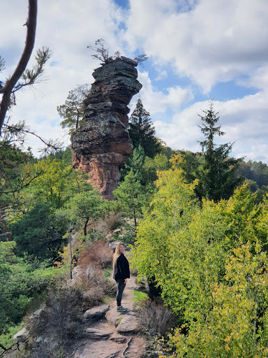 Dieser ausnehmend schlanke, von hieraus geradezu labil wirkende, 31 Meter hohe Turm gehört zu den Anwärtern auf den Titel "Barbarine der Pfalz". Er wurde bereits 1914 erstiegen, mit Hilfe einer Kiefer. Heute (mangels Kiefer) bietet er Routen zwischen III und VIII-.