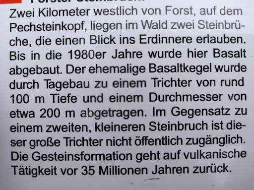 In 1991, quarry work in Margarethental was stopped. To this day, the surface of some streets in Forst still consists of basalt cobblestones from Pechsteinkopf. After the grinder and cable car were dismantled, the edges of the funnel were cordoned off to protect them from being walked on.