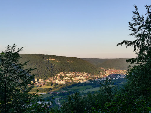 I think the closest parking lot is at the Naturfreundehaus. Follow the road past Netto across the railway and soon you'll find signs for NFH / Naturfreundehaus.